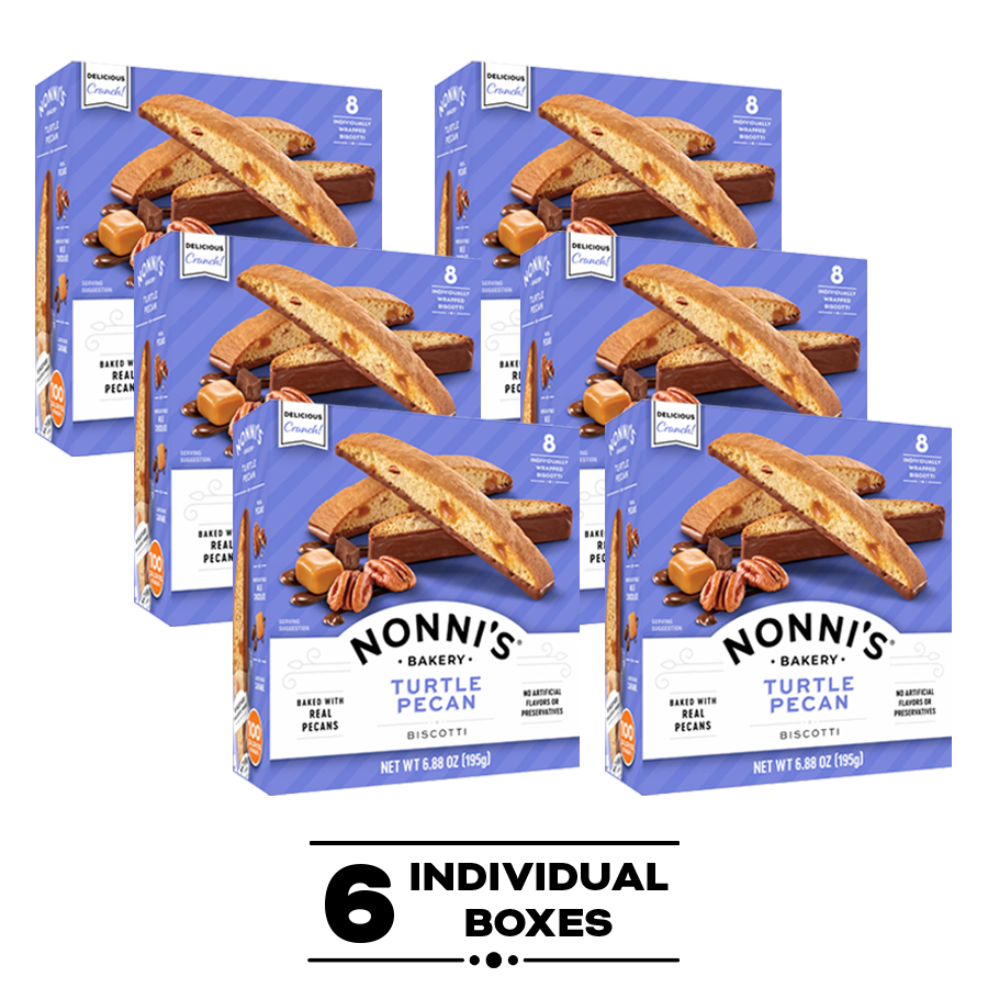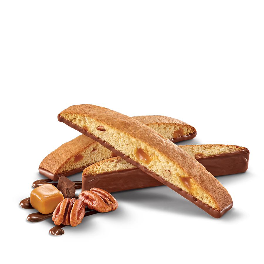 Indulge in the decadent charm of our Turtle Pecan Biscotti. Crafted with a delicate crunch, loaded with premium pecans and luscious caramel bits, and dipped in creamy milk chocolate, this treat is a decadent delight.